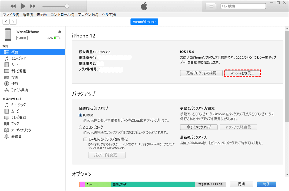 ステップ 4. IPSWファイルを選択し、「開く」をクリックします。すると、ポップアップウィンドウが表示され、iTunesがデバイスをiOS 15に復元することを伝えるので、「復元」をクリックして確認します。