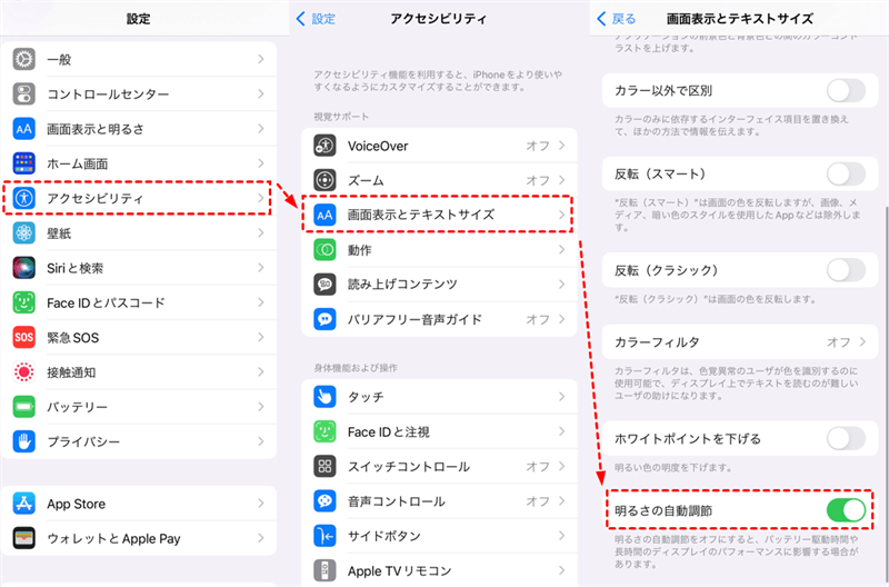 iPhoneの「設定」>「一般」>「アクセシビリティ」をタップ>「画面表示と文字サイズ」をクリック>「明るさの自動調節」をオンにします。