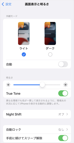 「設定」>「ディスプレイと明るさ」をタップ>「True Tone」を有効にします。次に、「自動ロック」をタップして、短い自動ロック時間を選択します。