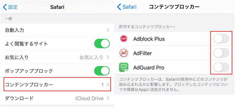 Safariブラウザのコンテンツブロッカーを無効にする手順:
