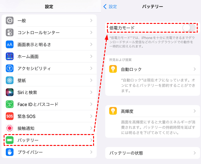 低電力モードをオフにして、「iPhoneの写真を共有できない」問題を解決してみてください。「設定」>「バッテリー」に移動し、「低電力モード」を一時的に無効にします。