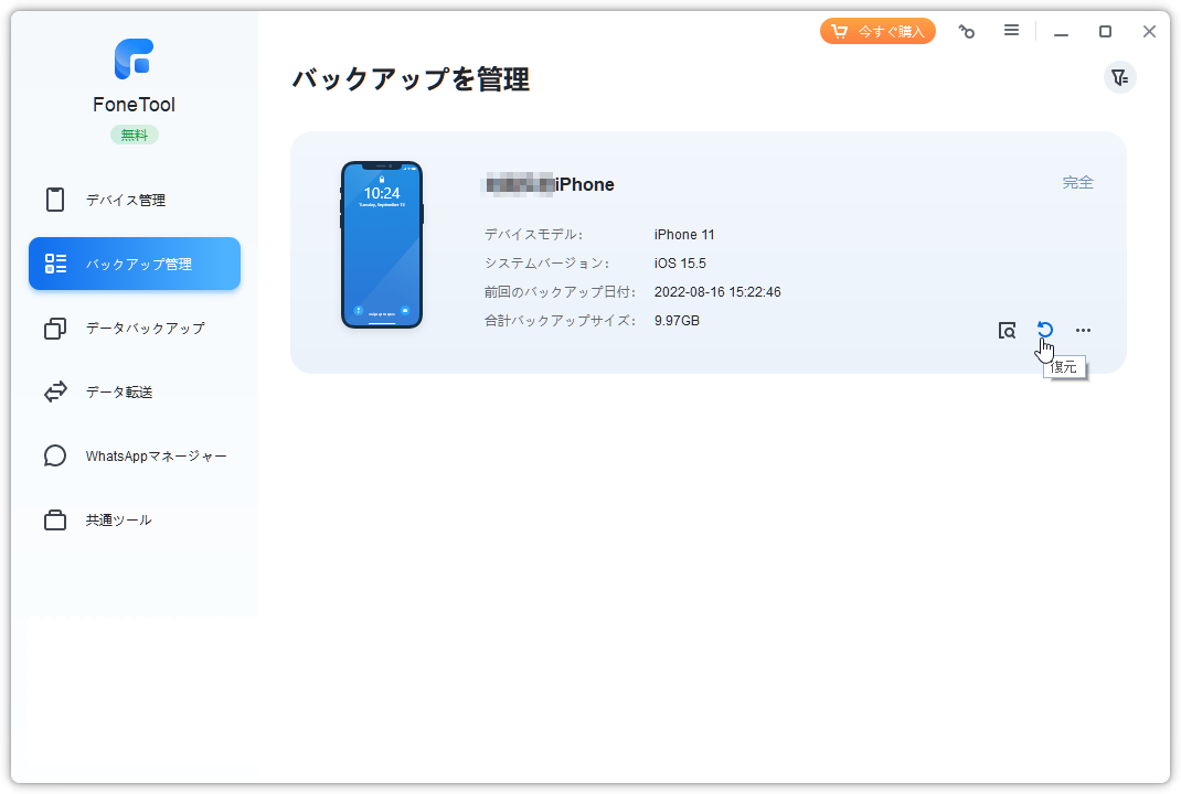 iTunesと比べて、FoneToolがあれば、データを失ったり、バックアップファイルを見れなくなったりする心配がありません。それに、iPhoneを転送したり、iPhoneを消去したりすることもできます。ぜひお試しください。