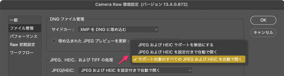 ステップ 2. 「ファイル管理」をクリックし、「JPEG、HEIC、およびTIFFの処理」セクションで、「JPEGおよびHEICを設定付きで自動で開く」または「サポート対象のすべてのJPEGおよびHEICを自動で開く」のいずれかを選択し、「OK」をクリックして変更を保存します。