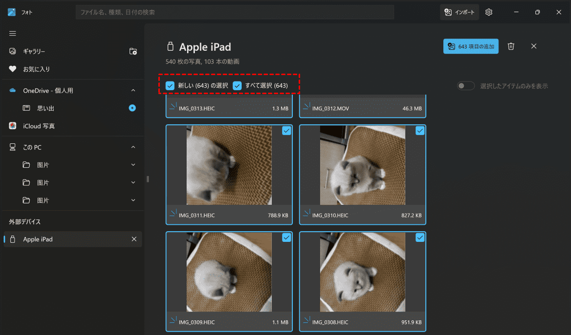 お使いのパソコンがWindow10/11の場合、付属の「フォト」アプリを使って、iPhoneをPCに接続した後、簡単に写真を取り込むことができます。アプリ内で「インポート」機能を使って、iPhone内の写真を選び、パソコンに保存することが可能です。
