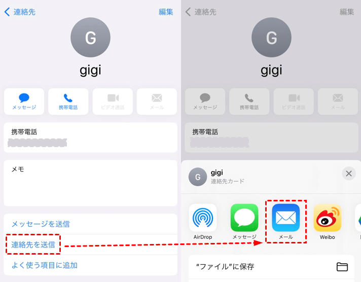ステップ 2. 「連絡先を送信」をクリックし、「メール」を選択します。