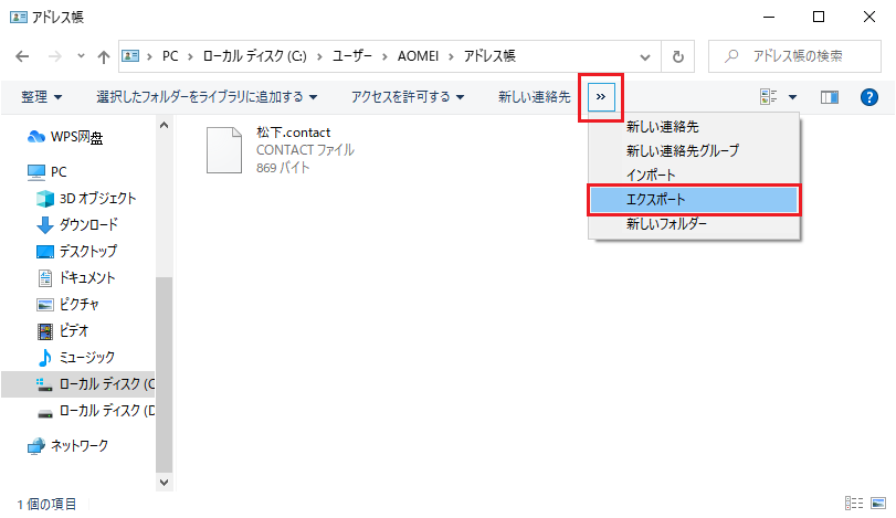 移行された連絡先を確認するには、「PC」>「ローカルディスク(C:)」>「ユーザー」>「(自分のユーザー名)」>「アドレス帳」に移動します。