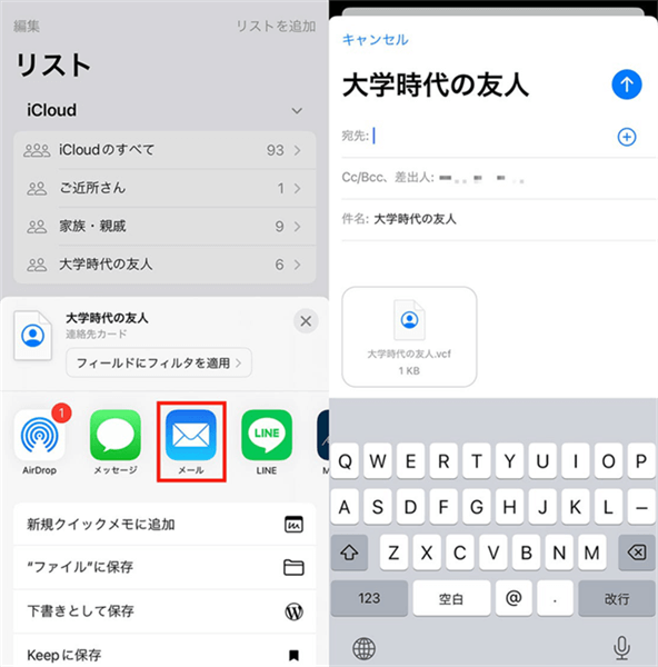 ステップ 4. 「メール」をタップして書き出した連絡先カードを送信します。