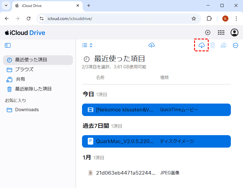 ステップ 4. iCloud Driveをクリックして、「最近使った項目」または「Download」フォルダーで動画ファイルを選択し、画面上部の「ダウンロードアイコン(雲に↓)」をクリックします。