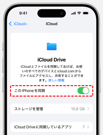 ステップ 1. iPhoneで「設定」アプリを開き、「自分の名前」>「iCloud」>「このiPhoneを同期」をタップしてiCloud Driveをオンにします。