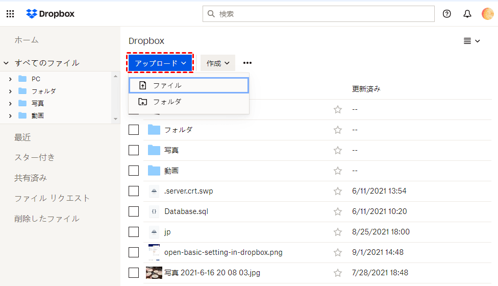 ステップ 1. パソコンでブラウザを起動し、Dropboxの公式サイトにアクセスし、PCから必要な曲をアップロードします。