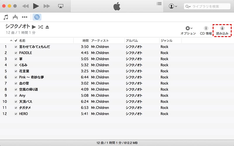 ステップ 2. iTunesにCDアイコンが表示されたら、クリックします。入れたい項目をチェックして、「読み込み」をクリックします。