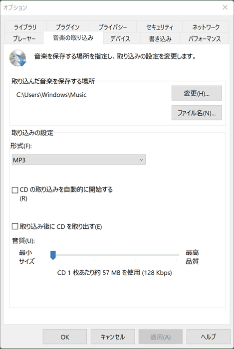 ステップ 2. Windows Media Playerで、「整理」>「オプション」>「音楽の取り込み」を選択します。