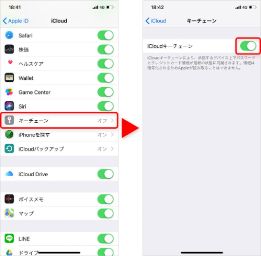 2. iPhoneで、「設定」→自分の名前→「iCloud」→「キーチェーン」をタップし、「iCloudキーチェーン」のスイッチをオンにします。パスコードまたはApple IDのパスワードを入力します。数分待ちます。