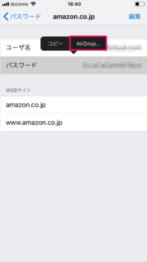 3. 転送するWebサイトまたはアプリのパスワードを選択します。パスワードをタップし続けて、「AirDrop」を選択します。