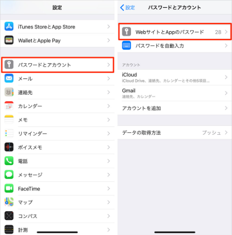 iPhoneで「設定」→「パスワードとアカウント」→「WebサイトとAppのパスワード」をタップし、Touch IDを使用してすべてのアカウントとパスワードを見ることができます。