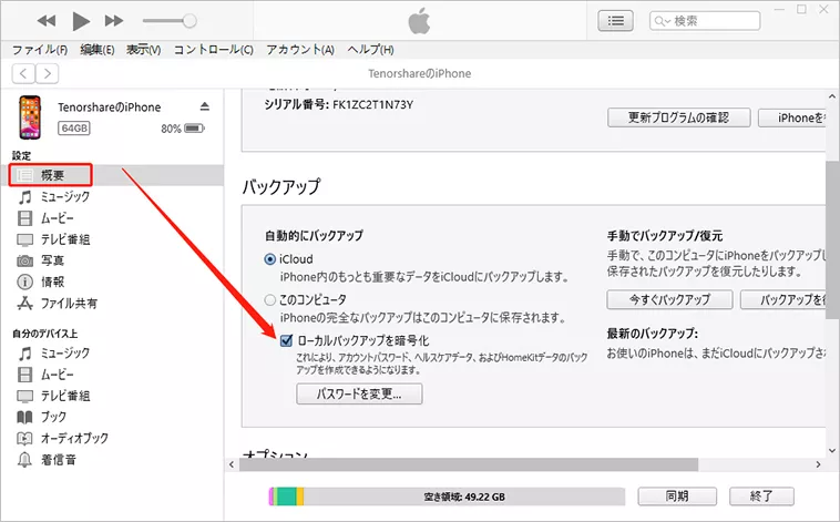 3. 「概要」タブの「バックアップ」セクションで、「ローカルバックアップを暗号化」にチェックを入れ、パスワードを作成して、「今すぐバックアップ」をクリックします。数分待ってプロセスを完了してから、古いiPhoneを取り外します。