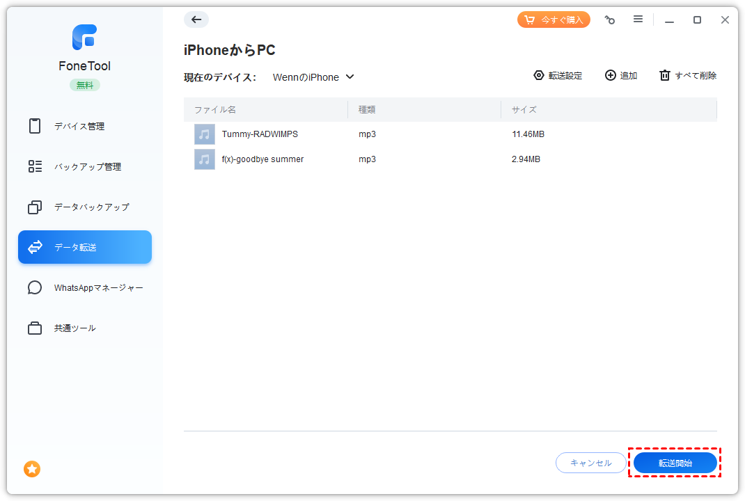 5. フォルダアイコンをクリックして、古いiPhoneからパソコンに転送したデータを選択します。「転送開始」をクリックして、それらのデータを新しいiPhoneにインポートします。