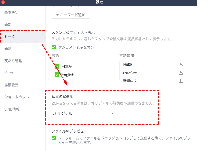LINEの画面左下にある「横の三転(...)」ボタン>「設定」>「トーク」をクリックします。右側の画面で「写真の解像度」の「標準」から「オリジナル」に変更してください。