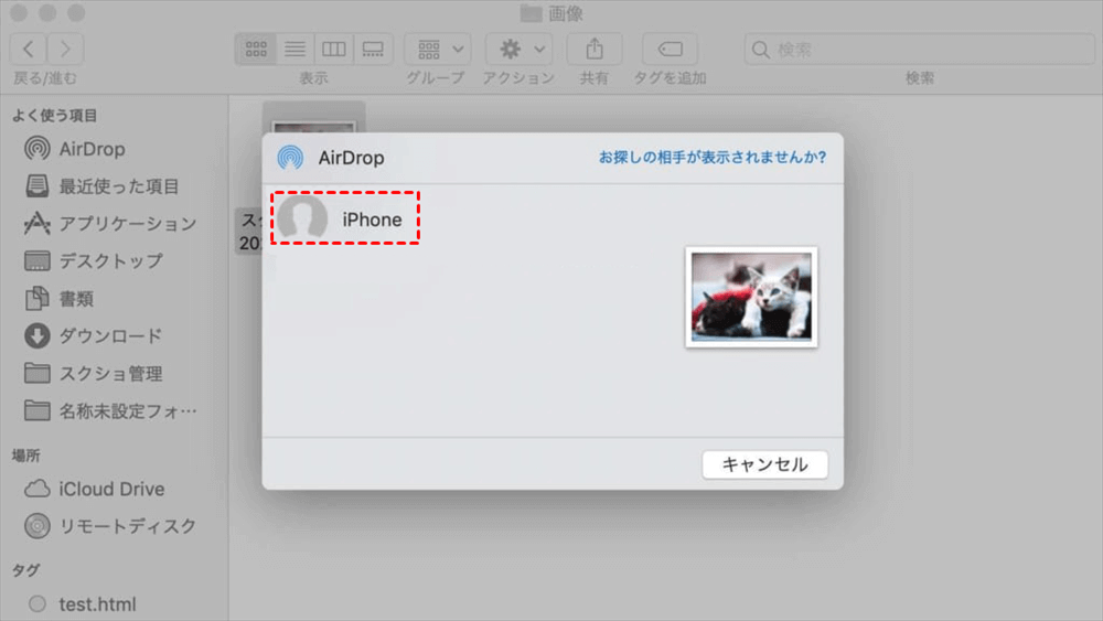 ステップ 2. MacでiPhoneに入れたい写真を「右クリック」して「共有」から「AirDrop」をクリックします。またはツールバーの「共有」ボタンをクリックして、「AirDrop」を選択します。近くにいるAirDropユーザが示されます。