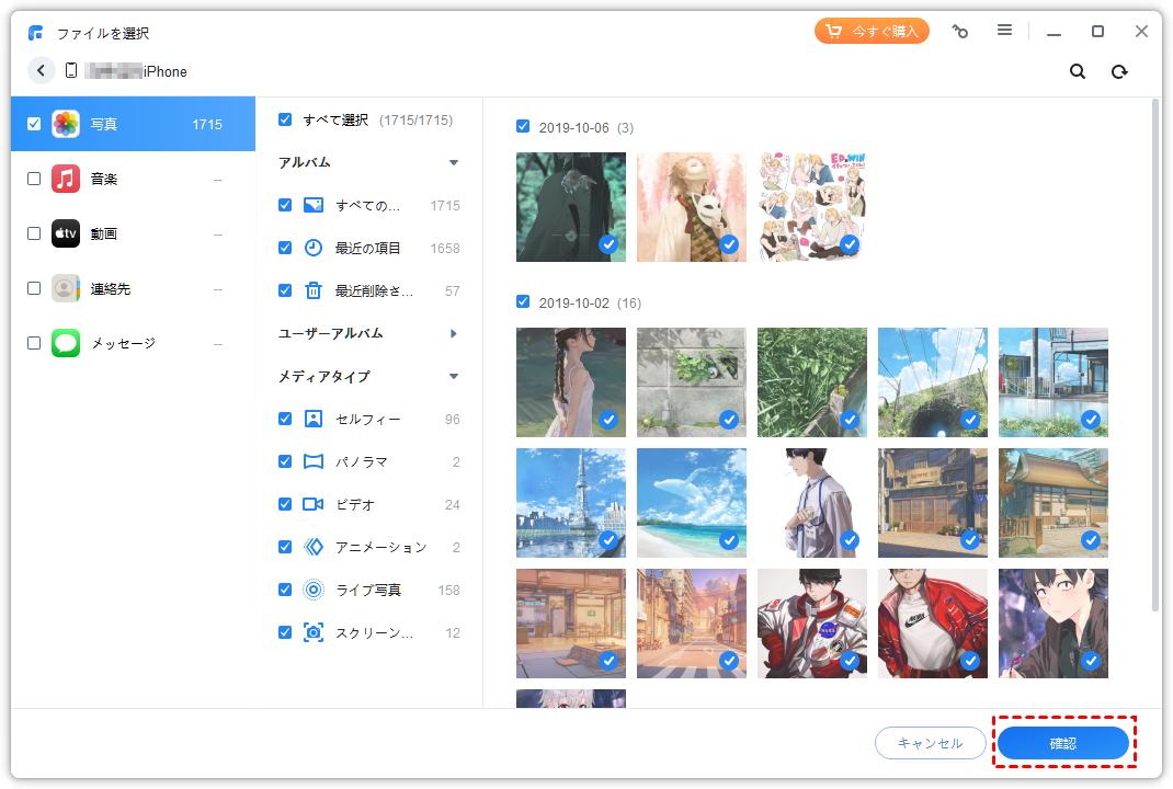 ステップ 3. 写真とすべてのアルバムをチェックして、iPad上のすべての写真をバックアップすることができます。または、必要な写真を選択します。そして、「確認」ボタンをクリックします。