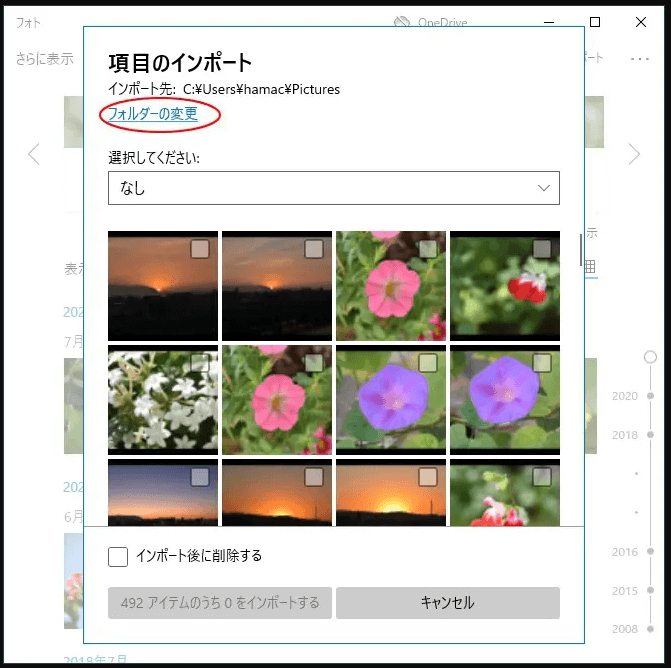 手順 5. 「項目のインポート」画面が表示されます。インポート先のフォルダはデフォルトで「ピクチャ」になっています。「フォルダーの変更」をクリックして、保存先を指定・変更できます。