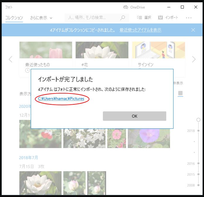 「インポート中」の画面が表示されます。転送する写真の枚数が多いと少し時間がかかります。インポートが完了すると、「インポートが完了しました」が表示されます。保存先のフォルダがリンクされているので、クリックすると保存されたことを確認できます。