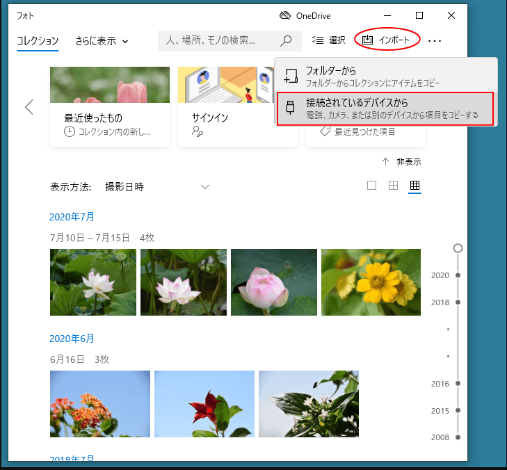 手順 3. 右上にあるフォトのメニューから「インポート」をクリックし、「接続されているデバイスから」を選択します。