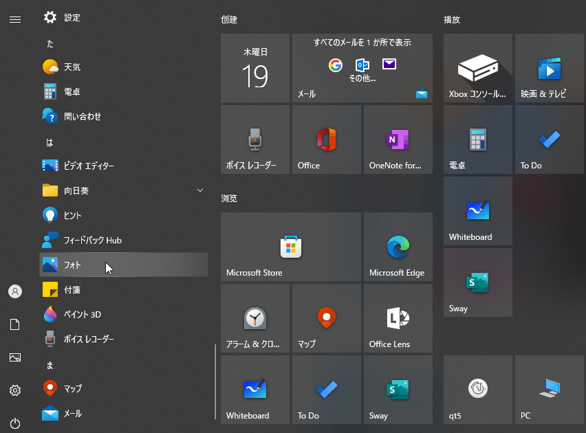 ☛「フォト」画面が表示されない場合、左下のスタートボタンをクリックして左アプリケーションリストから「フォト」を1クリックで立ち上げます。