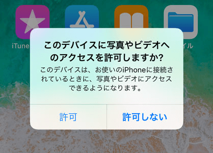 ☛パソコンにiPhoneを接続すると、iPhoneの画面に「このデバイスに写真やビデオへのアクセスを許可しますか?」が表示されるので、「許可」をタップします。