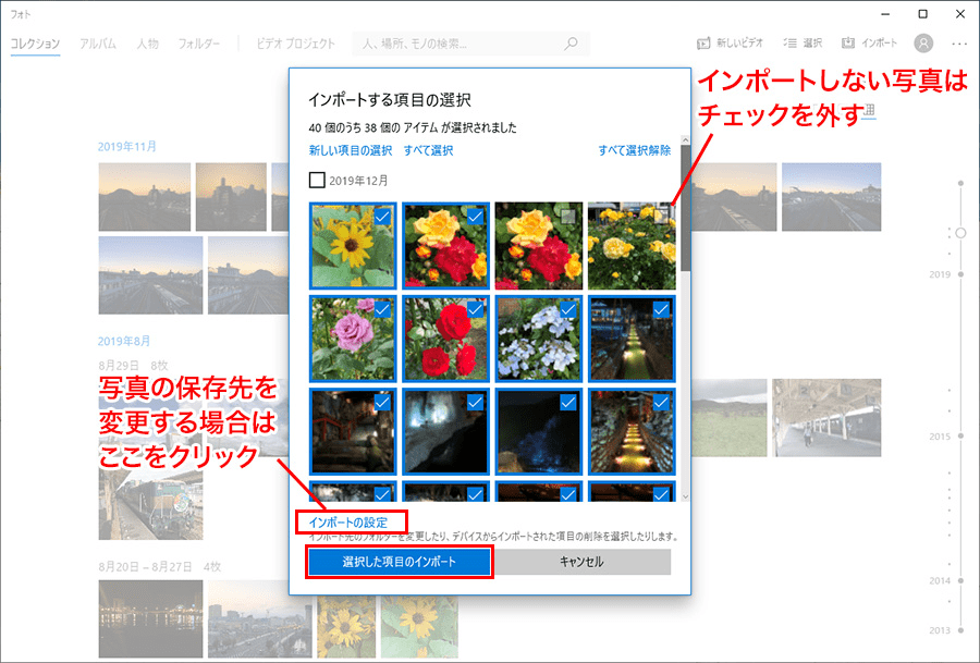 ステップ 4. インポートしたくない他の写真やビデオのチェックを外します。「選択した項目のインポート」をクリックすると、インポートされます。