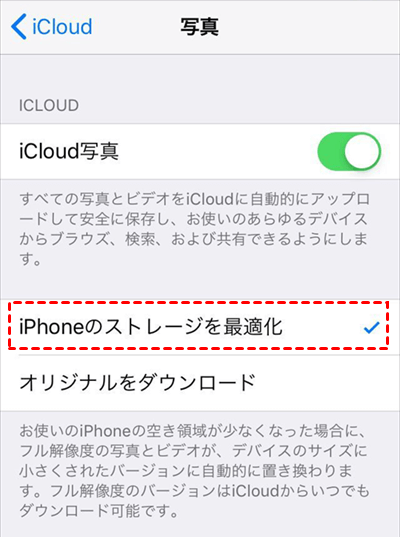 - iOSデバイスの容量が不足している場合、「iPhoneのストレージを最適化」オプションを有効にすると、写真が占める容量を減らすことができます。この方法で、お使いのiPhoneは、元の写真やビデオがiCloudに保存されている間、デバイス上の唯一のサムネイルを保存します。