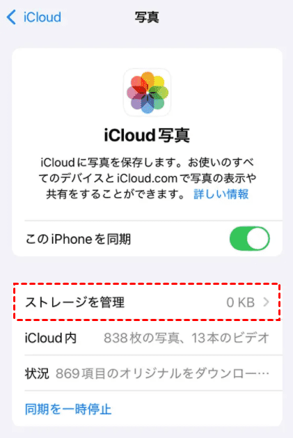 1. 「iCloud写真」や「このiPhoneを同期」のスイッチが灰色になったら、「ストレージを管理」をタップします。