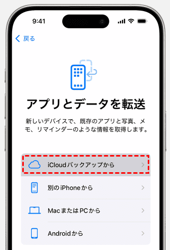 ステップ 2. リセットしたiPhoneに電源を入れ、「アプリとデータを転送」画面まで初期設定をします。「iCloudバックアップから」を選択しApple IDでiCloudにサインインします。