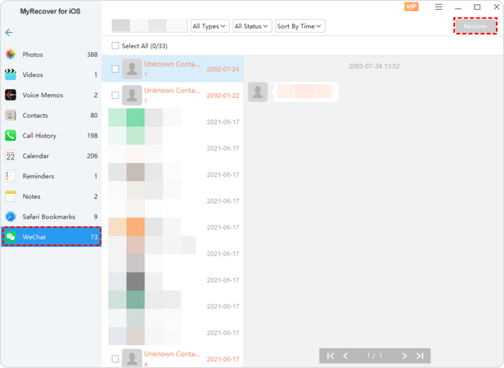 ステップ3:検出されたiPhoneのWeChatトーク履歴がリストに表示され、紛失したトーク履歴にチェックを入れて、右下の「復元」ボタンをクリックして、誤って削除されたメッセージを復元します。このように、数回クリックするだけで、簡単にWeChatメッセージを復元できます。