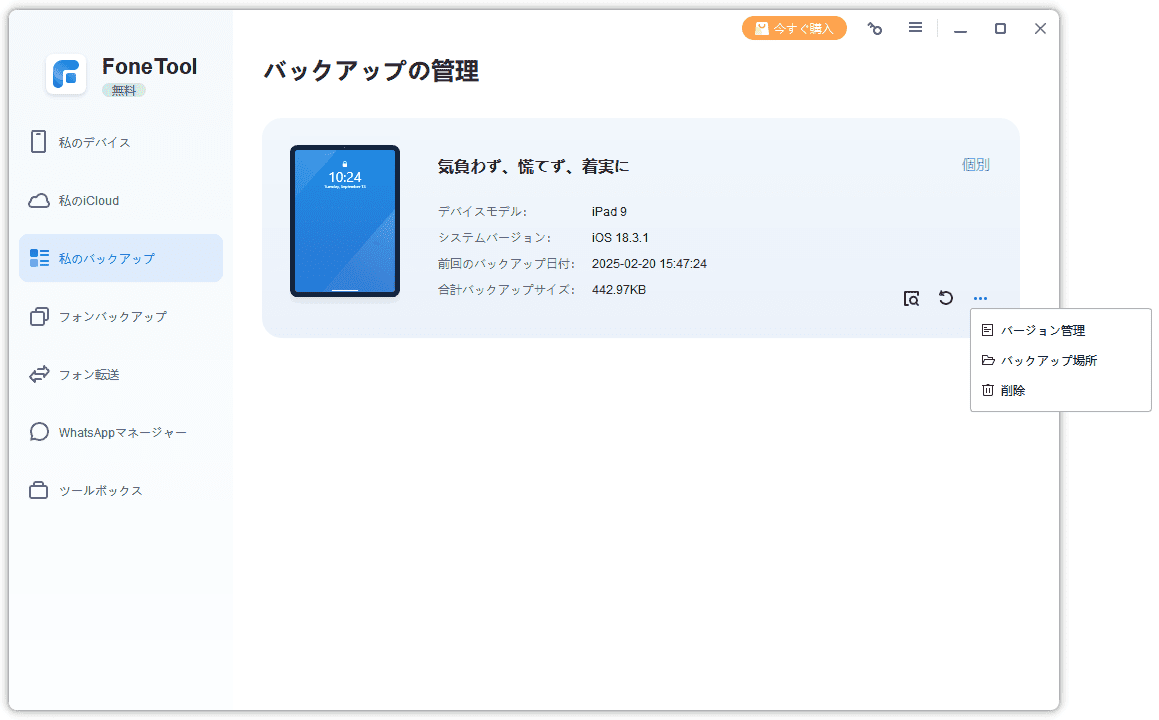 WeChatのトーク履歴に限らず、大切なデータが突然消えてしまうリスクに備えるためには、日頃からiPhone全体をバックアップしておくことが非常に重要です。特にiCloudの容量が足りない、またはパソコンでの柔軟な管理を希望する場合は、FoneToolの活用をおすすめします。