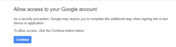 以下はその手順です。GoogleのDisplay Unlock CAPTCHAページにアクセス>セキュリティメッセージが表示されたら「Continue」をクリック>ユーザー名とパスワードを入力してログインします。
