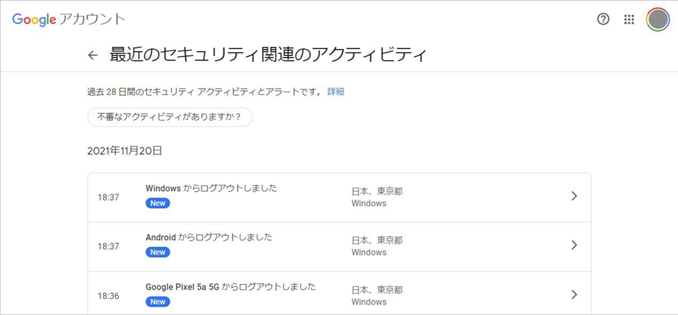 ステップ 1. https://myaccount.google.com/>左ペインから「セキュリティ」をクリック>「最近のセキュリティ関連のアクティビティ」をクリックします。