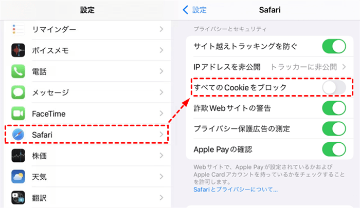 ステップ 1. iPhoneの「設定」>「Safari」>「プライバシーとセキュリティ」セクションにスワイプダウンし、「すべてのCookieをブロック」をオフに切り替えます。