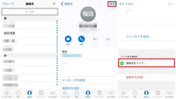 ステップ 2. 連絡先の情報画面で、右上の「編集」ボタンをタップ>「連絡先をリンク」をタップします。