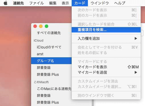 ステップ 1. Mac上の連絡先アプリに移動>「カード」をクリック>「重複項目を検索」を選択します。