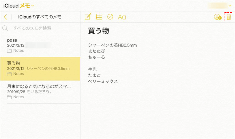 ステップ2. メモアイコンをクリック>削除したいメモを選択して参照>ゴミ箱アイコンをクリックしてメモを削除します。