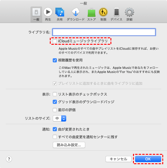 iTunesで「編集」をクリック>「環境設定...」を選択>プロンプトウィンドウで「一般」を選択>「iCloudミュージックライブラリ」の横にあるボックスにチェックを入れる>「OK」をクリックして確認します。