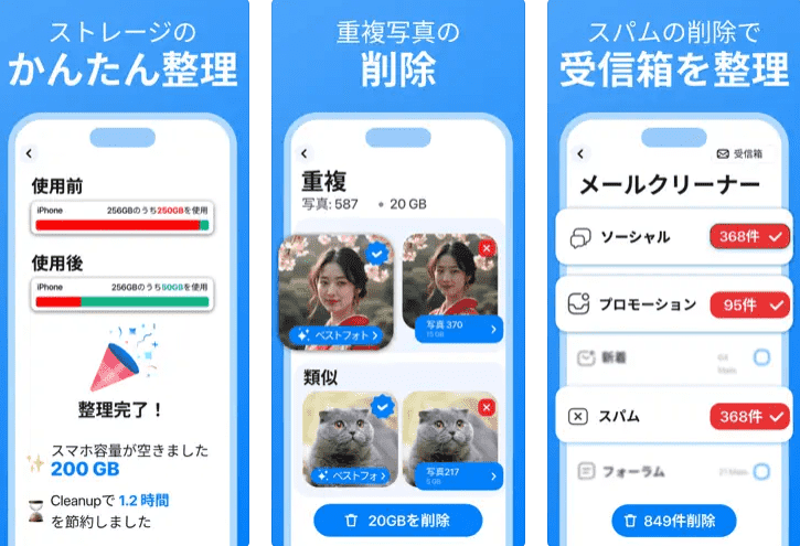 Cleanup:スマホ写真をかんたん整理!は、iPhone内の重複した写真やビデオを自動で見つけて削除できる便利なアプリです。シンプルなインターフェースと写真の分類機能により、整理作業がスムーズに行えます。