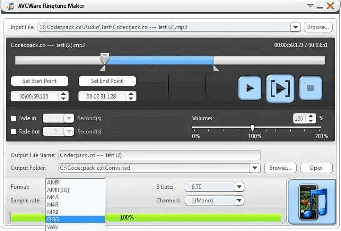 AVCWare Free Ringtone Makerは任意のビデオまたはオーディオファイルを携帯着メロに変換するプロセスを簡素化します。MP3、WAV、WMA、M4A、OGG、AC3、AAC、RA、AMRなどの幅広い入力と出力オーディオファイル形式をサポートし、iPhoneやSamsungデバイスのような人気のある携帯電話モデルと互換性があります。また、お気に入りの映画やビデオからサウンドトラックを抽出し、MP3、M4Rなどの形式で着信音を作成することもできます。