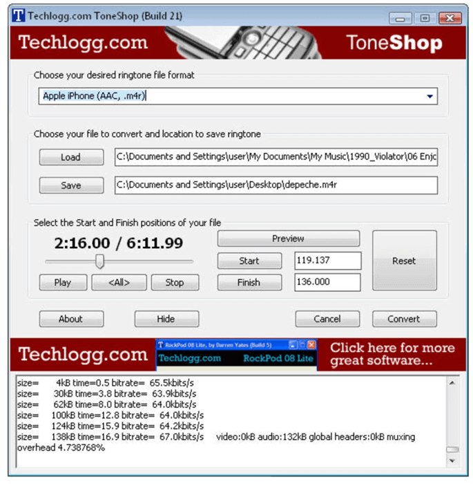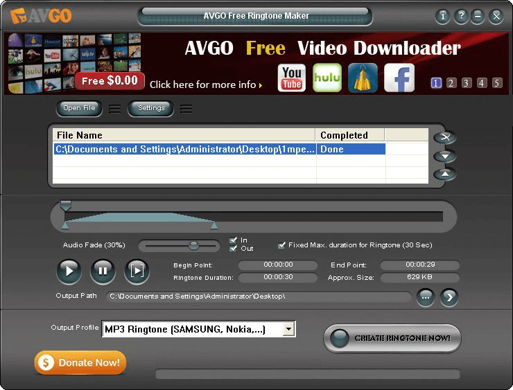 AVGO Free Ringtone Makerはフリーソフトで、PCとラップトップで動画と音声ファイルから着信音を作成できます。また、フェードインやフェードアウトなどの特殊効果が含まれており、WMV、MKV、RM、RA、MOV、M4A、AVI、FLVなどの人気のあるYouTubeやiPhoneのフォーマットをサポートしています。