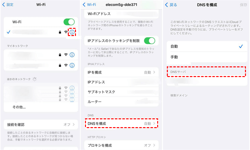 ステップ 2. 「DNSを構成」をタップ>「自動」から「手動」に変更する。次に、サーバーの追加からGoogle DBSサーバー8.8.8.8または8.8.4.4を追加します。