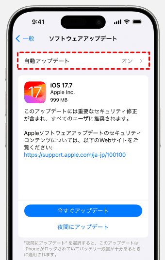 手順:「一般」>「ソフトウェアアップデート」をタップして、「自動アップデート」のスイッチをオフに設定します。