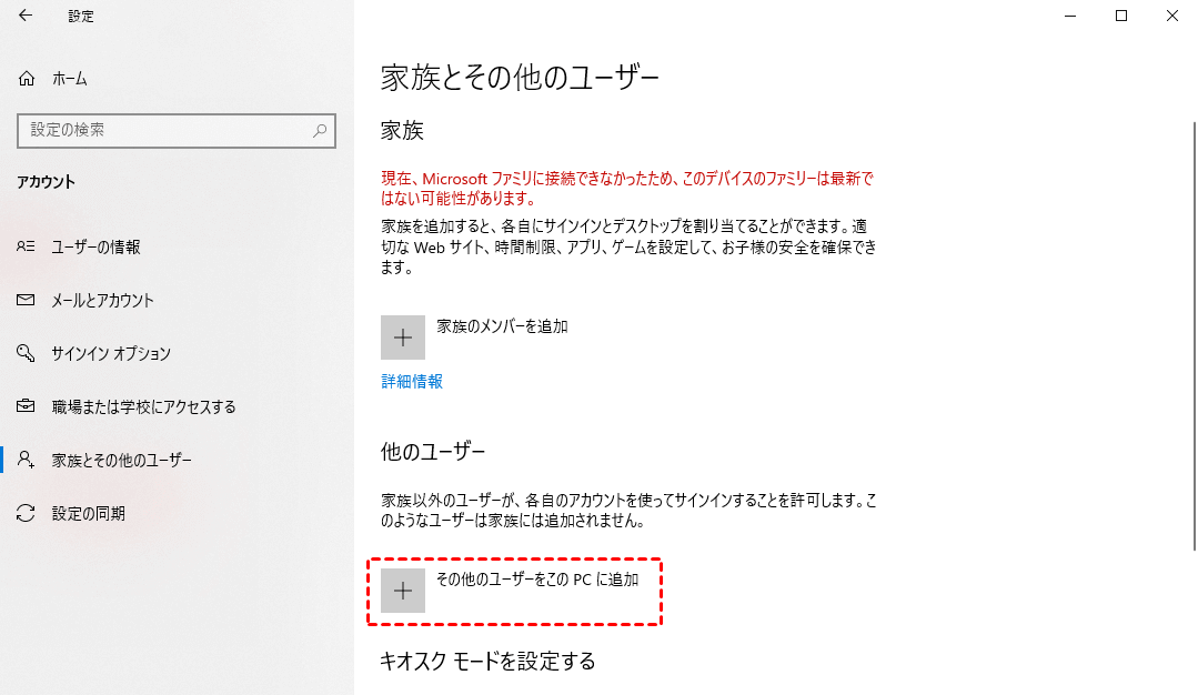 ステップ 2. 「アカウント」>「家族とその他のユーザー」ページ>「このPCに他のユーザーを追加」オプションに進みます。