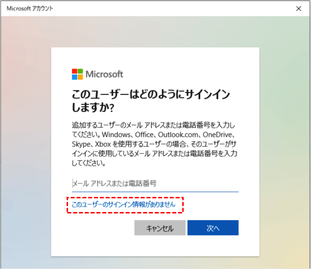 ステップ 3. 「このユーザーはどのようにサインインしますか」画面が表示されたら、「この人のサインイン情報がありません」と表示されたリンクをクリックし、「アカウントの作成」画面が表示されます。