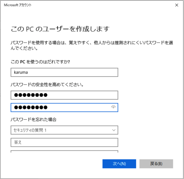 ステップ 5. 「このPCのユーザーを作成します」ページで、アカウントのユーザー名とパスワードを入力します。「次へ」をクリックして次に進みます。